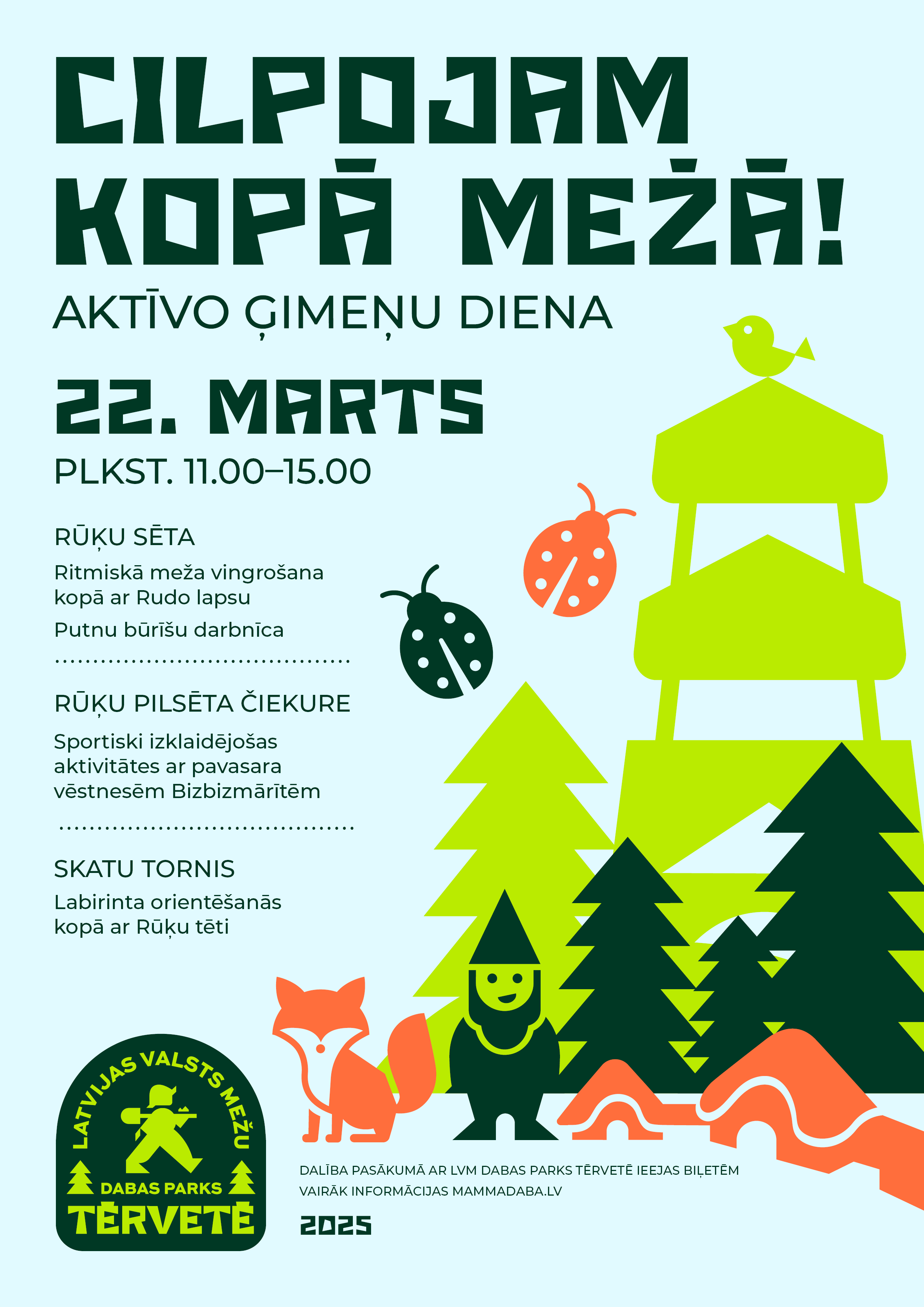 Latvijas valsts mežu dabas parks Tērvetē 22. martā gaidīs aktīvos, sportiskos un azartiskos dabā gājējus pasākumā “Cilpojam kopā mežā”! No pl. 11.00 līdz 15.00 piedāvāsim piedalīties sportiskās aktivitātēs, popularizējot aktīvu dzīvesveidu meža vidē.