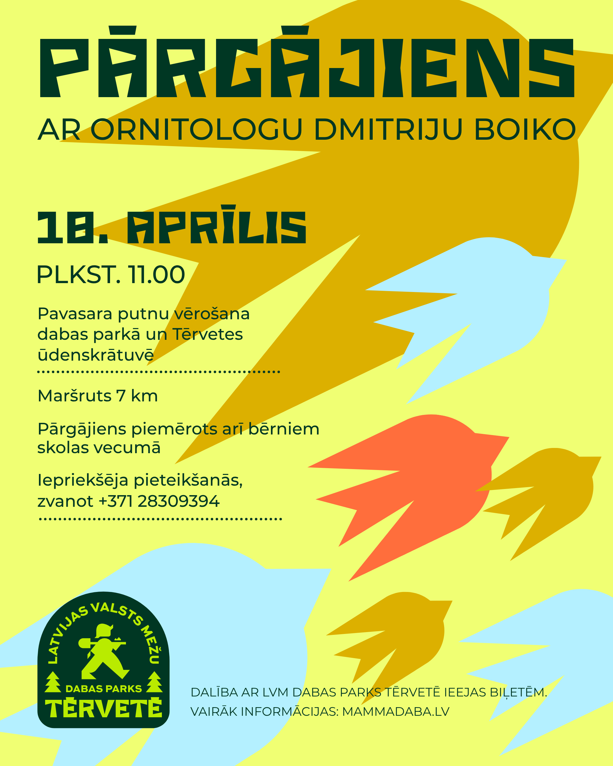 Aprīlis Latvijā ir putnu mēnesis, kad pakāpeniski atgriežas gājputni un riesto ligzdotāji. Ikviens interesents 18. aprīlī plkst. 11.00 aicināts piedalīties pavasara putnu vērošanas pārgājienā Latvijas valsts mežu dabas parkā Tērvetē un Tērvetes ūdenskrātuves apkārtnē pieredzējuša ornitologa Dmitrija Boiko vadībā.