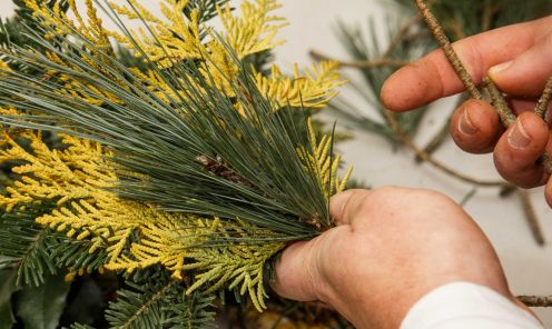 Izvēlētos zarus sagriež nepieciešamajā garumā. Zaru garums atkarīgs no tā, cik kuplu, spurainu vai kompaktu vēlamies adventes vainagu. Sagrieztos zarus sasien nelielās čupiņās.