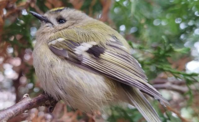 Compared to the head, the rest of the goldcrest’s plumage is quite modest: the upper body is light moss-green in the front, gradually becoming olive-green, the wings are noticeably darker and grayer, with two white transverse stripes, and the belly is pale gray-yellow or greenish-white.